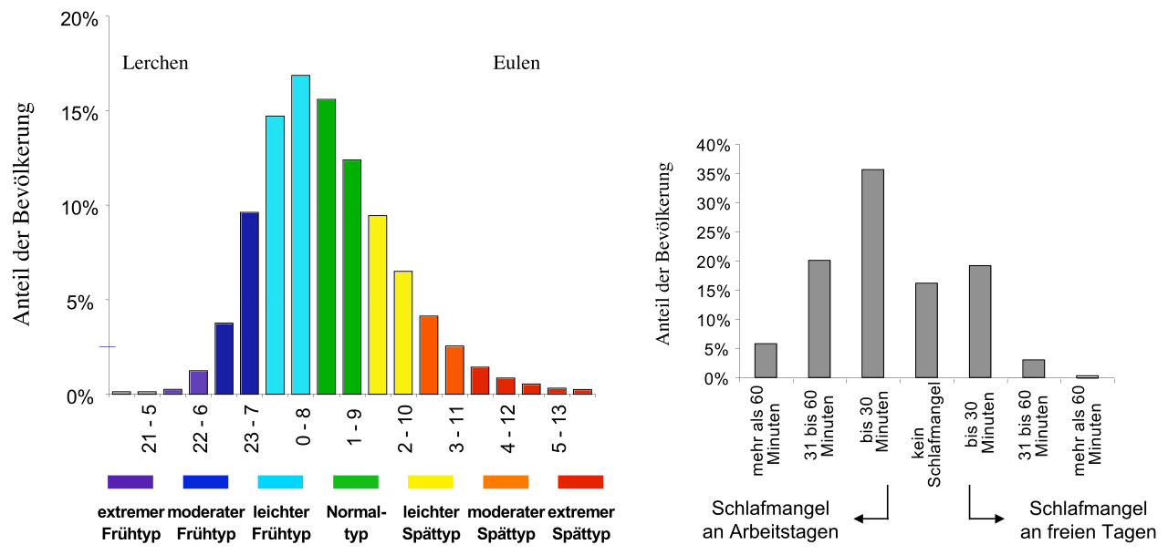 Zu den Lerchen zählen vor allem Kleinkinder und Frauen, während Männer in den ersten 40 Jahren ihres Lebens eher zu den Eulen gehören. Nachweislich verschieben sich diese Zuordnungen allerdings, um sich im Laufe des Lebens zwischen den Geschlechtern anzugleichen und sogar umzukehren.